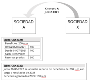 La consulta plantea la siguiente situación: la sociedad “A” fue adquirida en junio de 2021 por la sociedad “X”. En el año 2021 la sociedad “A” obtuvo un beneficio de 200 u.m., correspondiendo 100 u.m. al periodo previo a la adquisición por la sociedad “X” y 100 u.m. al periodo comprendido entre la fecha de adquisición por “X” y el cierre del ejercicio 2021, teniendo unas reservas previas por importe de 300 u.m. El 30 de junio de 2022, la Junta General de Accionistas de “A” aprueba un reparto de 200 u.m. con cargo a los resultados de 2021. Durante el ejercicio 2022 y hasta la fecha de aprobación del dividendo, la sociedad “A” ha generado beneficios por importe de 150 u.m.