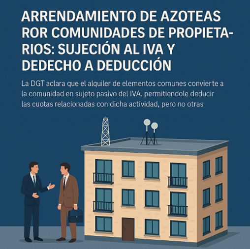 - La DGT afirma que el arrendamiento de la azotea es una prestación de servicios sujeta y no exenta de IVA, ya que constituye una cesión de uso de un bien a título oneroso. La comunidad de propietarios pasa a ser considerada empresario o profesional y debe repercutir el impuesto al arrendatario, presentar las declaraciones correspondientes y podrá deducir el IVA soportado en bienes y servicios relacionados con esa actividad.