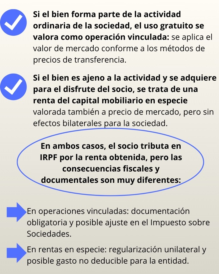 Si el bien pertenece al giro ordinario de la sociedad, se aplica el régimen de operaciones vinculadas (art. 41 LIRPF y art. 18 LIS); si el bien es ajeno a la actividad y se destina al disfrute del socio, se valora como renta en especie conforme al art. 43 LIRPF.
