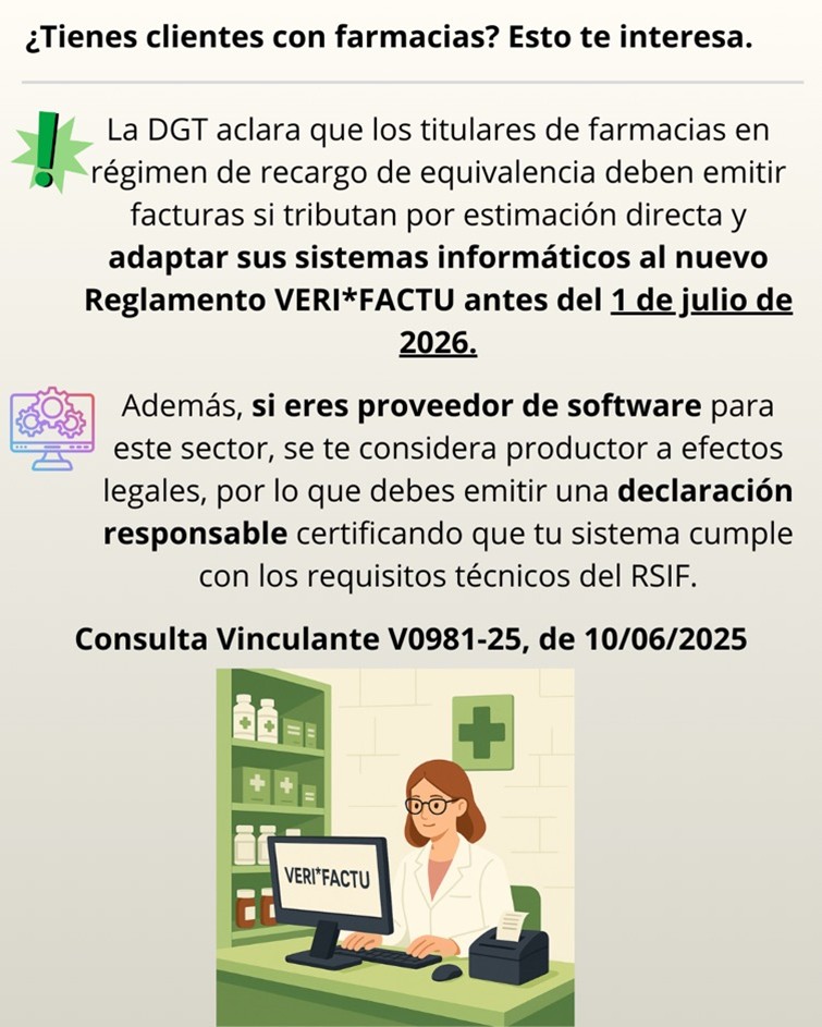 La DGT confirma la obligación de los farmacéuticos de emitir facturación conforme a normativa tributaria, incluso bajo recargo de equivalencia, y establece la sujeción de sus proveedores informáticos al marco técnico-regulatorio del sistema Veri*Factu.