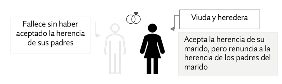 En el año 2022 se produce el fallecimiento de una persona física sin haber aceptado ni repudiado la herencia de sus padres. En el año 2023, y conforme lo establecido en el artículo 1006 del Código Civil, la viuda y heredera de esta persona fallecida ejercita el derecho transmitido y renuncia a la herencia de los padres del causante en instrumento público ante notario, aceptando la herencia de este último.