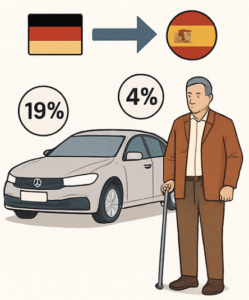 - En Alemania el tipo general sería 19 % y en España, por su condición y destino del vehículo, pretende la aplicación del 4 %.