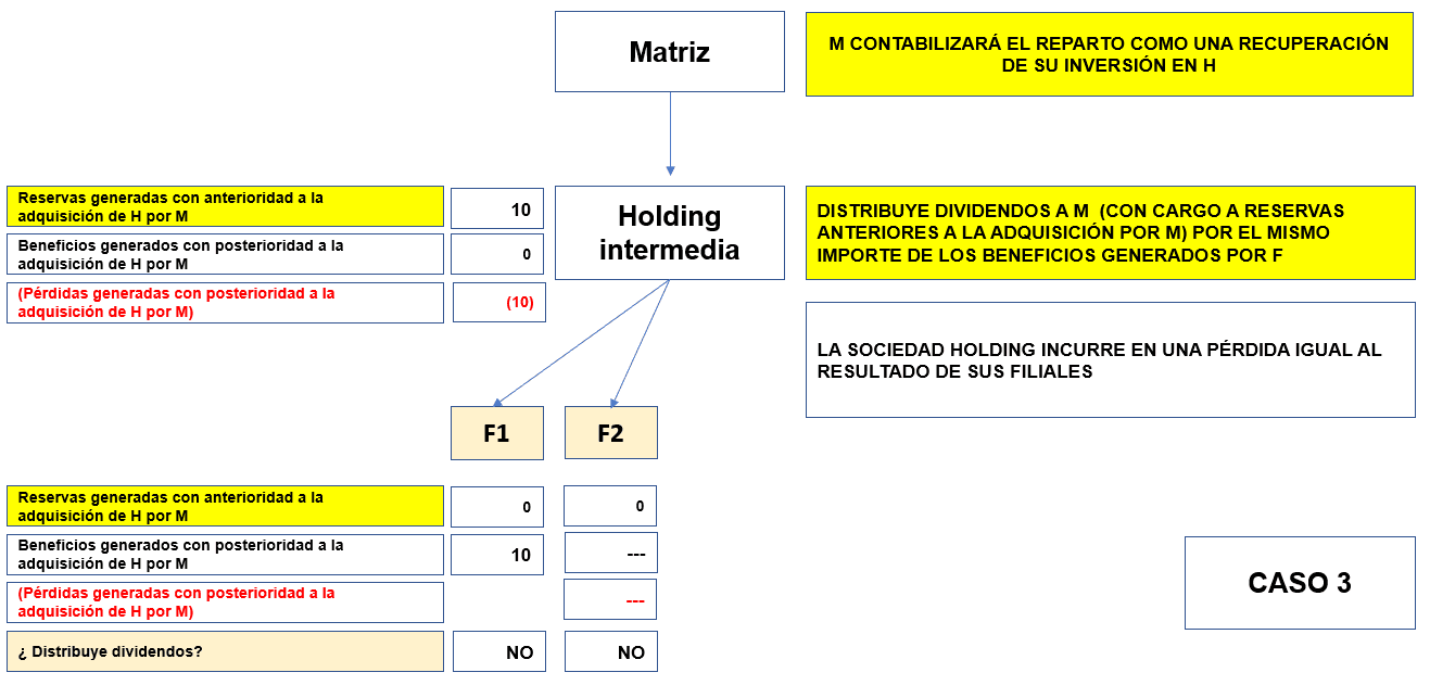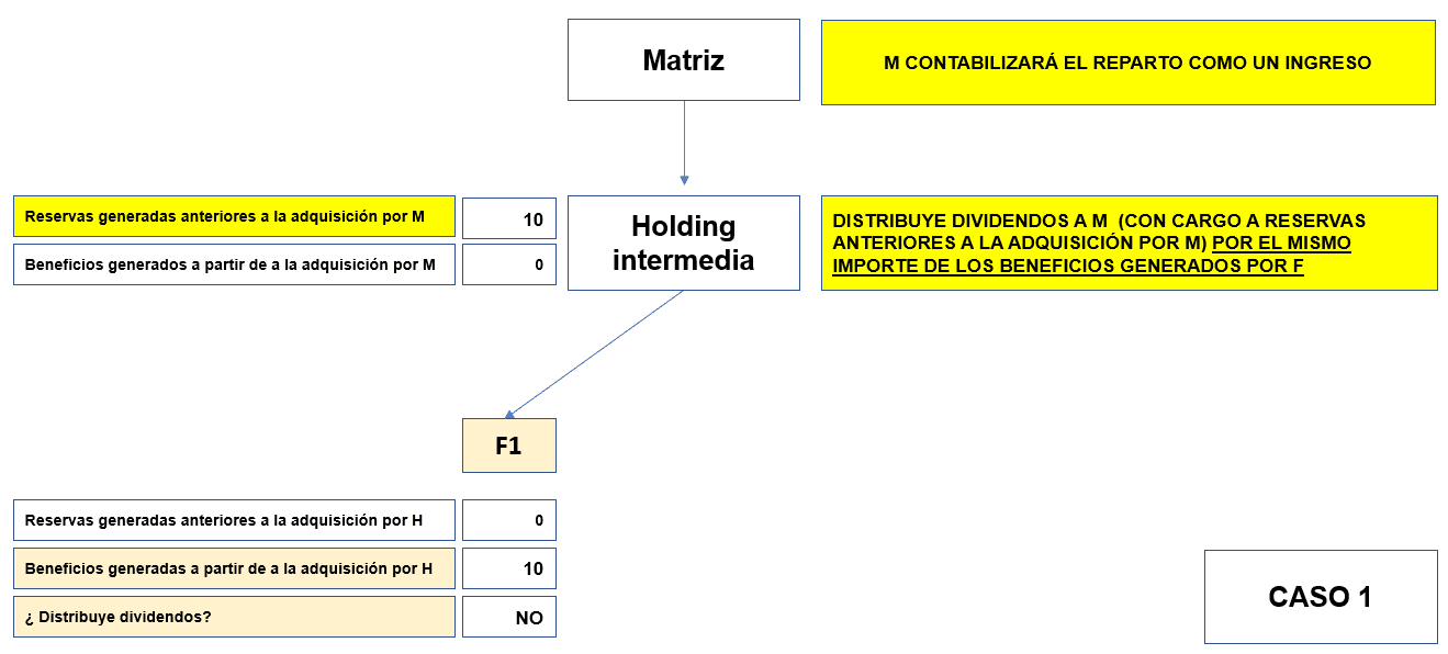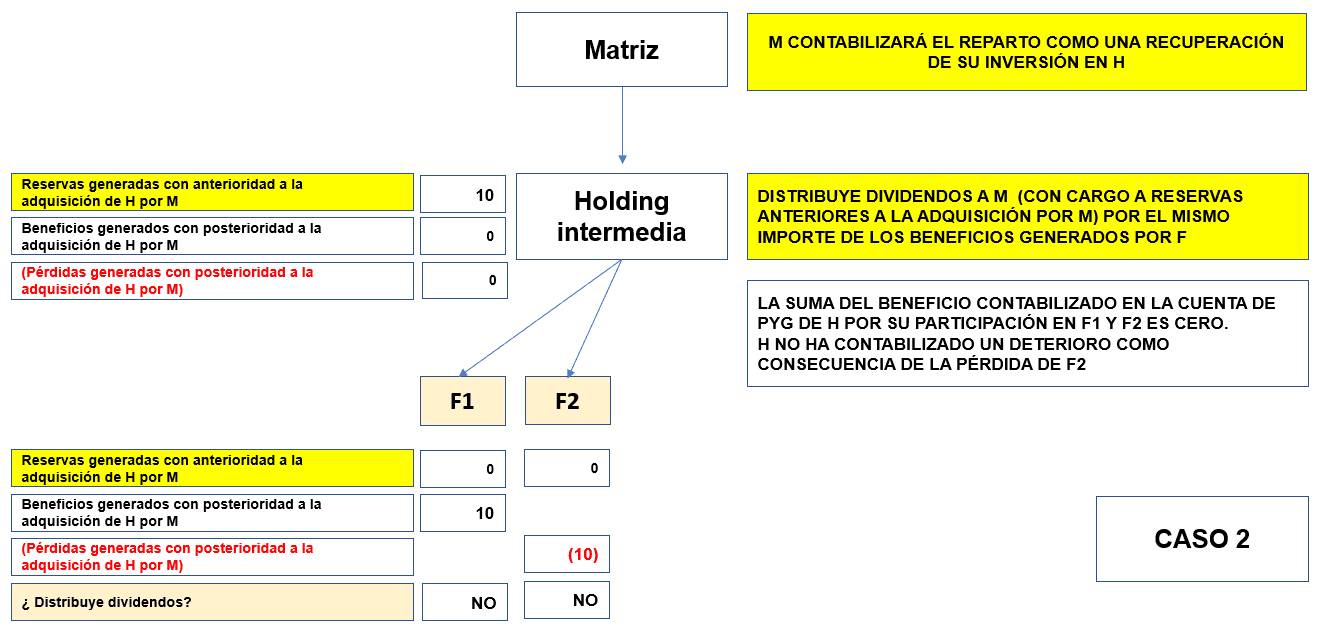 H no recibe dividendos ni de F1 ni de F2, pero distribuye a M un importe de 10 de sus reservas generadas con anterioridad.