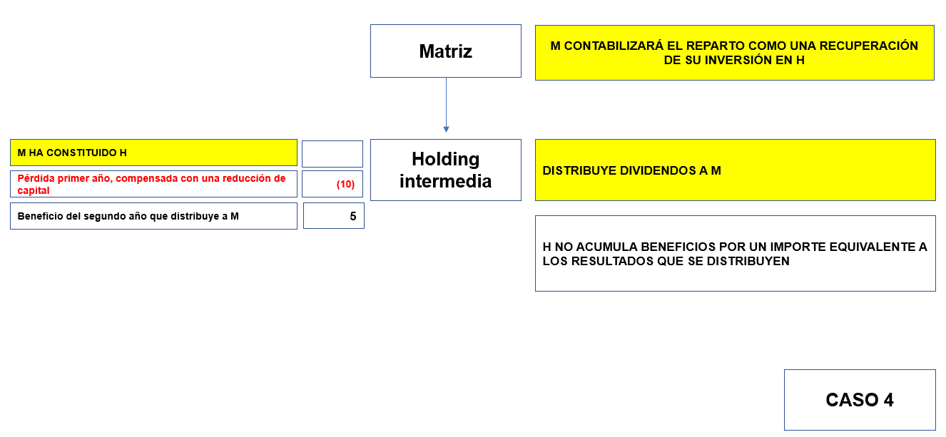 Desde su constitución por M, H ha generado una pérdida de 10 el primer año, compensada con una reducción de capital. Sin embargo, la inversión de M en H mantiene su valor original, en la medida en que no existe un deterioro de valor. Posteriormente, H genera un beneficio de 5 el segundo año que distribuye a M.