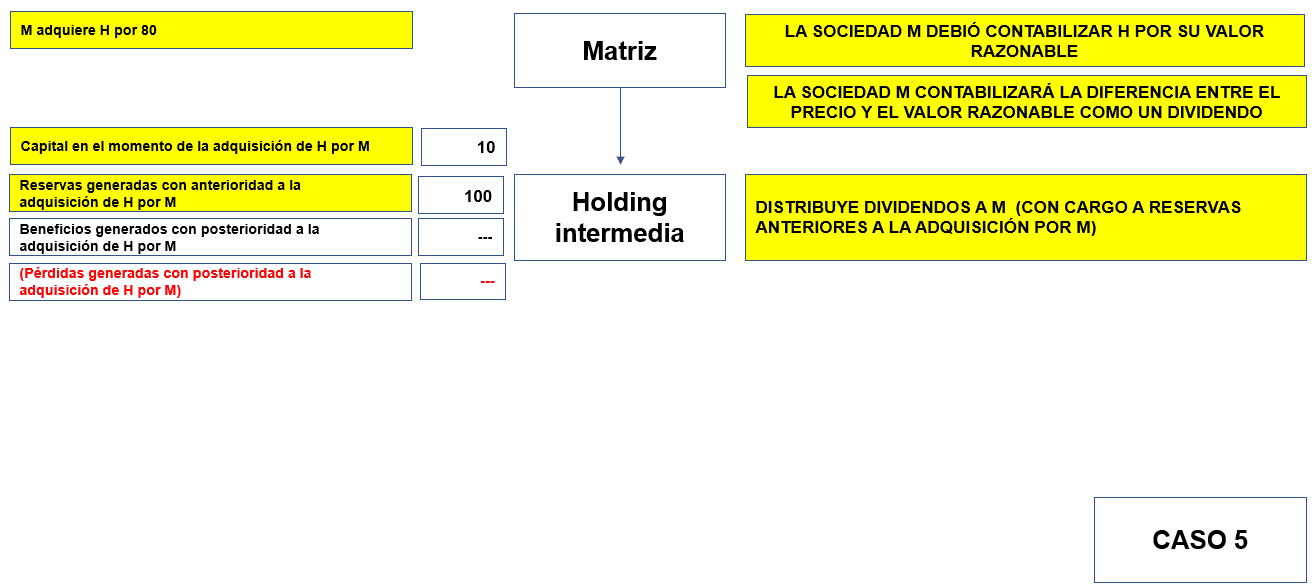 H tiene una pérdida de 10 desde que es adquirida por M, pero reservas generadas con anterioridad por 10 que distribuye a esta última.