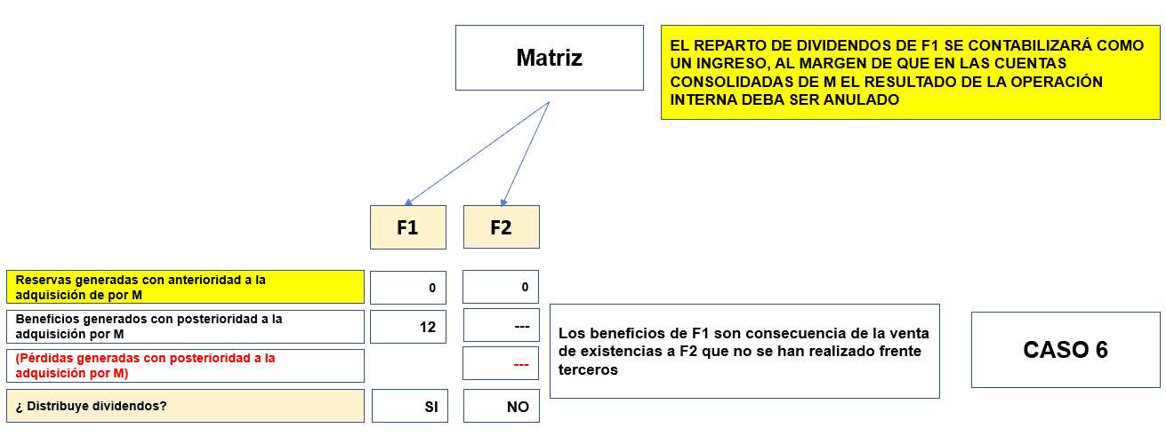 Con posterioridad a la adquisición F1 tiene un resultado de 10 por ventas de existencias a F2, producidas después de la compra por M, que no se ha realizado frente a terceros ajenos al grupo.