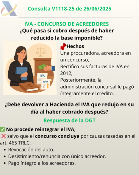La DGT concluye que no procede volver a incrementar la base imponible ni reembolsar el IVA si el concurso no ha concluido por las causas del art. 465.1º, 3º y 5º TRLC.