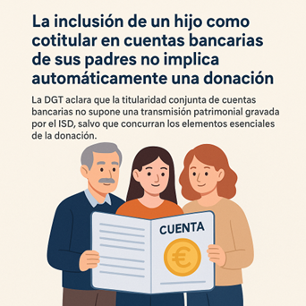 La DGT aclara que la titularidad conjunta de cuentas bancarias no supone una transmisión patrimonial gravada por el ISD, salvo que concurran los elementos esenciales de la donación
