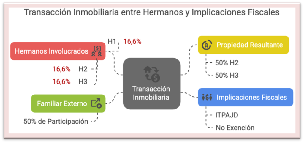- La operación propuesta consiste en que H2 y H3 adquirirán la parte de H1 (16,6%) y del otro familiar (50%). Como resultado, el inmueble será copropiedad de H2 y H3 al 50% cada uno.