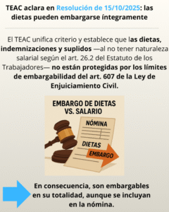 - La empresa recurrió ante el TEAR de Andalucía, que estimó: entendió que no había culpa o negligencia y que el art. 607 LEC cubre también la “retribución o su equivalente”, por lo que no procedía excluir las dietas de los límites embargables.