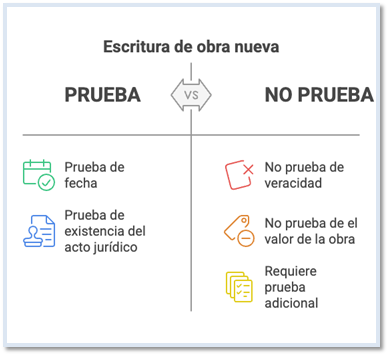 La escritura de declaración de obra nueva, como documento público, solo prueba la existencia del acto jurídico y la fecha en que se otorga, pero no prueba el importe de la mejora que se consigne en la misma.
