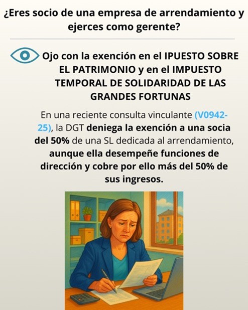 - El cónyuge del administrador como empleado en el alquiler de inmuebles no impide la exención en el Impuesto sobre el Patrimonio