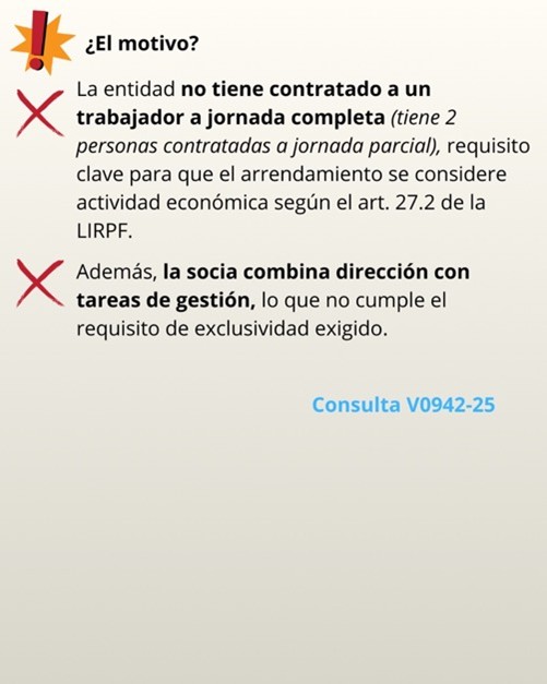- De la información facilitada, parece que las funciones que desempeña la consultante en la entidad no implican el ejercicio único de las funciones propias de dirección en la misma, sino que, además, realiza las funciones de gestión de la actividad de arrendamiento. Por otra parte, no tiene contratada al menos a una persona que realice las funciones de la actividad de arrendamiento, sino que tiene contratadas a dos personas a media jornada que realizan la función contable por lo que no cumple el requisito que exige el artículo 27.2 de la LIRPF para que la actividad de arrendamiento pueda considerarse una actividad económica. En cualquier caso, estas funciones –funciones directivas y gestión de la actividad de arrendamiento– no pueden recaer en una misma persona gestora competente.
