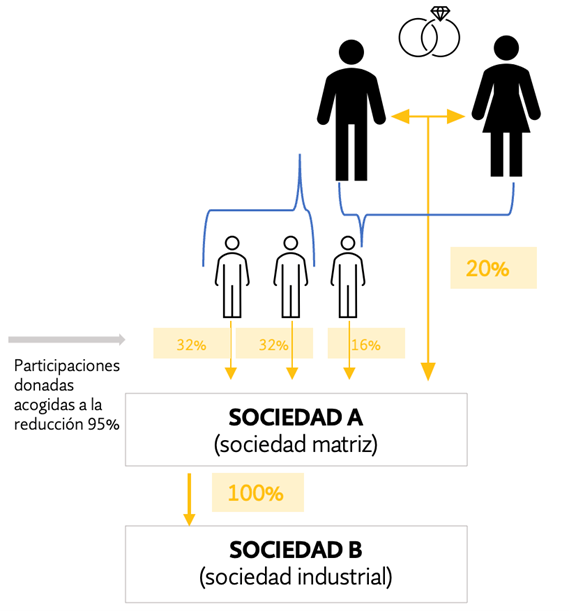 La persona física consultante, junto con sus hermanos, su padre y la esposa de éste, son titulares de la totalidad de las participaciones de la entidad A, entidad matriz que a su vez posee el 100% de la entidad B, empresa industrial.