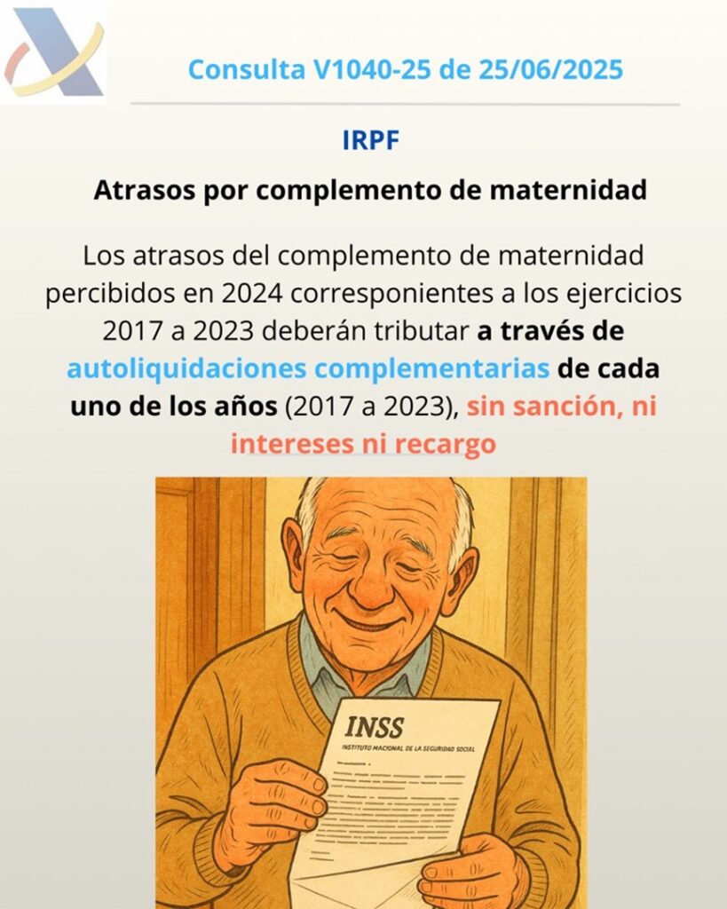 - El consultante pregunta sobre la tributación en el IRPF de los atrasos recibidos por el complemento de maternidad de los ejercicios 2017 a 2023.