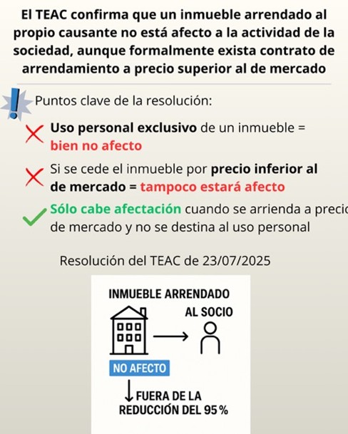 El TEAC confirma que un inmueble arrendado al propio causante no está afecto a la actividad económica y no computa en la reducción del 95% por empresa familiar. En ningún caso podrá considerarse que, si el bien estaba destinado exclusivamente al uso personal del transmitente y fue arrendado por precio igual o superior al de mercado, el bien se encuentra afecto pues, de acuerdo con lo previsto en el artículo 2.2.a) del decrero 414/2011, no se establece posibilidad alguna de que una contraprestación superior a la de mercado implique considerar la afectación, límite que si se establece respecto a las personas o entidades vinculadas.