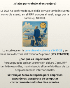 - Consulta si, en aplicación de la exención prevista en el artículo 7.p) de la Ley del IRPF, el día de viaje al extranjero debe computarse como día trabajado en el extranjero incluso si el vuelo sale después de las 12 del mediodía.