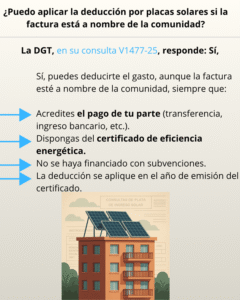- La contribuyente pregunta si puede aplicarse, en su declaración del IRPF, la deducción por obras de mejora de la eficiencia energética, pese a que la factura se emita a nombre de la comunidad de propietarios.