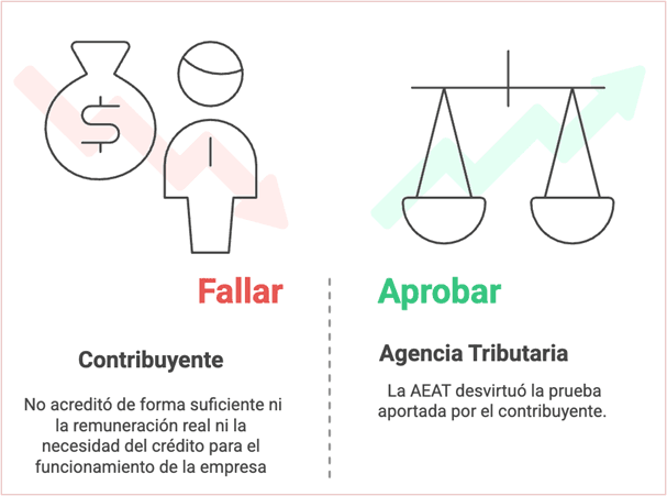 • A la Administración le corresponde desvirtuar la prueba aportada por el contribuyente. Si el contribuyente aporta contabilidad formalmente válida, declaraciones y justificaciones razonables, es la Administración quien debe demostrar que dicha afección es ficticia, artificiosa o económicamente injustificada. Sin embargo, en este caso concreto, el Tribunal estima que la documentación aportada (un apunte contable manuscrito, sin contrato de préstamo ni correlación directa con ingresos financieros en la cuenta de resultados) no acredita de forma suficiente ni la remuneración real ni la necesidad del crédito para el funcionamiento de la empresa.