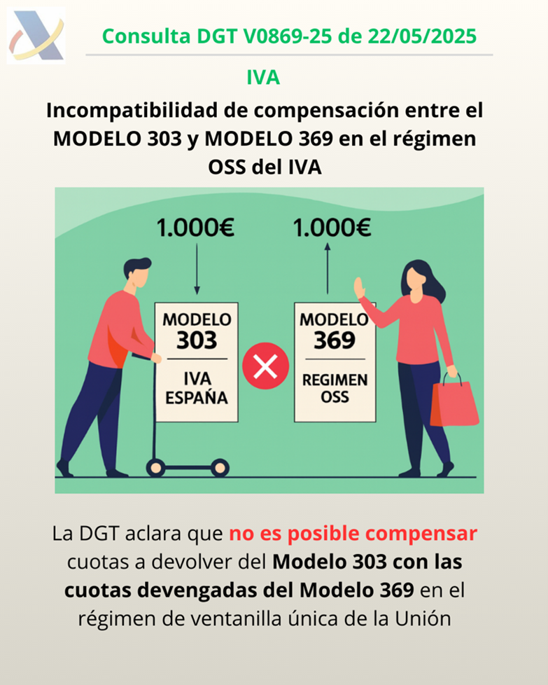 IVA. La DGT aclara que no es posible compensar cuotas a devolver del Modelo 303 con las cuotas devengadas del Modelo 369 en el régimen de ventanilla única de la Unión