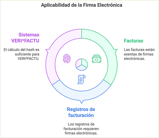 La obligación de firma electrónica no alcanza a las facturas, sino a los registros de facturación a los que resulta aplicable el Reglamento que establece los requisitos que deben adoptar los sistemas y programas informáticos que soporten los registros de facturación, salvo que se trate de sistemas VERI*FACTU, en cuyo caso será suficiente con que calculen la huella o «hash» de dichos registros.