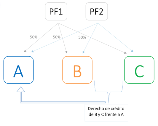 En definitiva, de acuerdo con el tratamiento contable, por la parte del préstamo, en su caso, condonado, correspondiente al porcentaje de participación que posee cada socio (PF1 y PF2), coincidente en las tres entidades (A, B y C), se considera que las entidades donantes (B y C) estarían distribuyendo reservas en especie a los socios (PF1 y PF2), consistente en el crédito que ostentan frente a A y, a su vez, tales socios estarían aportando la parte del crédito mencionado, a los fondos propios de la entidad donataria (A).