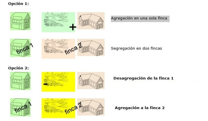 Los consultantes poseen en condominio dos inmuebles heredados; actualmente quieren adjudicar un inmueble a uno de los comuneros y el otro inmueble a los otros dos comuneros en proindiviso, sin compensaciones en metálico. Previamente, se quiere hacer la división respetando las construcciones existentes restando unos metros de un terreno no edificado a uno de los inmuebles y dándoselo al otro inmueble, bien mediante la agrupación de los dos inmuebles en una sola finca y posterior segregación en dos partes, bien mediante la segregación de una porción de uno de los inmuebles para agregarlo al otro inmueble.