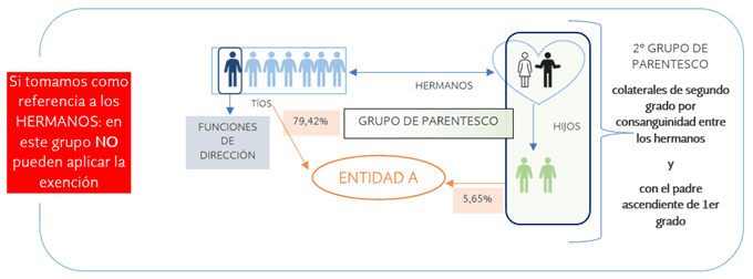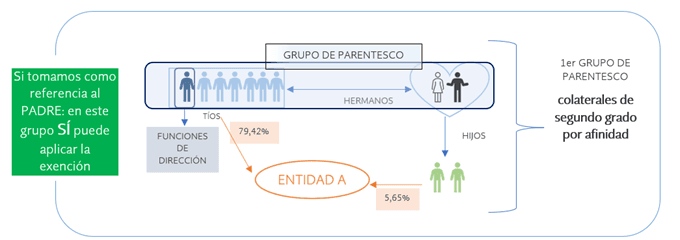 Quinta. Sin embargo, si el sujeto de referencia es cualquiera de los consultantes –o su padre, en el grupo que forma con sus hijos–,estos forman parte únicamente del grupo de parentesco en el que están integrados ellos junto con su padre, no cumpliéndose en este grupo el requisito relativo al ejercicio de funciones directivas, pues ninguno de sus miembros ejerce estas funciones en la entidad A. Por, lo tanto, no podrían aplicarse la exención en el P por la titularidad de las participaciones en la entidad A.