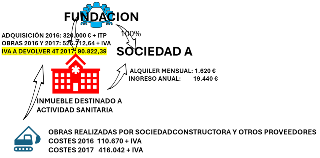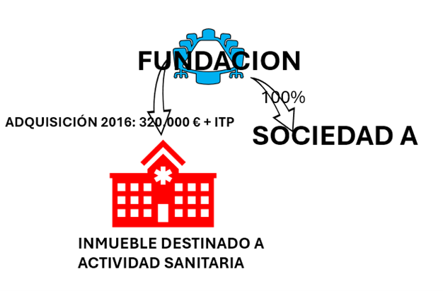 Adquiere un local que es objeto de reforma y acondicionamiento como consultorio para arrendarlo a la sociedad SOCIEDAD A, creada a tal efecto y participada íntegramente por la Fundación (ambas entidades vinculadas comparten domicilio fiscal y social, gerente, medios humanos y materiales y actividad sanitaria), por un precio que carece de sentido económico y que de ninguna manera se ajusta al valor de mercado. Sin embargo, le ha procurado una ventaja fiscal, consistente en obtener la deducción y finalmente devolución del IVA soportado en las obras de reforma de dicho local, a la que de otro modo no tenía derecho.