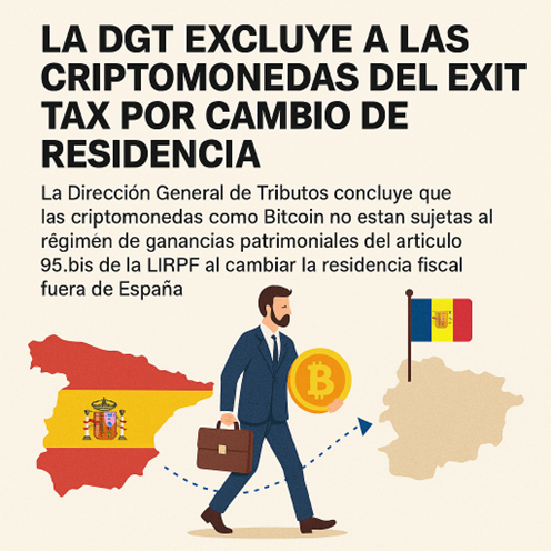 IRPF. EXIT TAX. La DGT excluye a los activos criptográficos del ámbito de aplicación del artículo 95.bis de la Ley del IRPF, consolidando su posición doctrinal en materia de fiscalidad internacional de patrimonios digitales