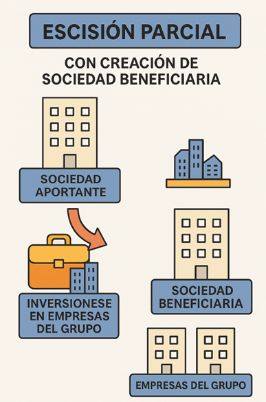 En el marco de una reorganización de un grupo empresarial, una sociedad (sociedad aportante) escinde parte de su patrimonio, formado por inversiones en empresas del grupo, y lo transmite en bloque a favor de una sociedad de nueva creación (sociedad beneficiaria). La sociedad aportante recibe a cambio la totalidad de las participaciones sociales representativas del capital de la sociedad beneficiaria.