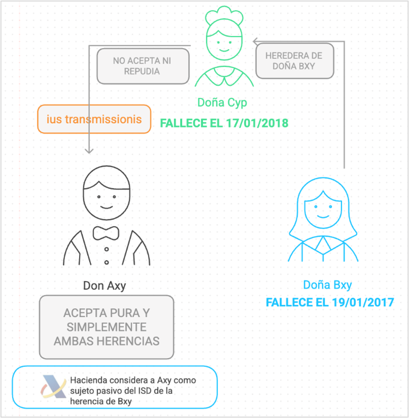 - Axy es sujeto pasivo del ISD al producirse una transmisión única desde Bxy a través de Cyp hacia él, bajo el ius transmissionis.
