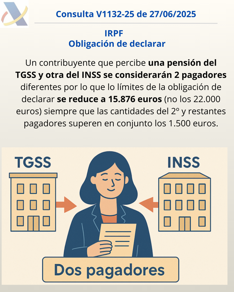 IRPF. DOS PAGADORES. La DGT nos recuerda que TGSS e INSS son pagadores distintos y reducen el límite de obligación de declarar en el IRPF 2024