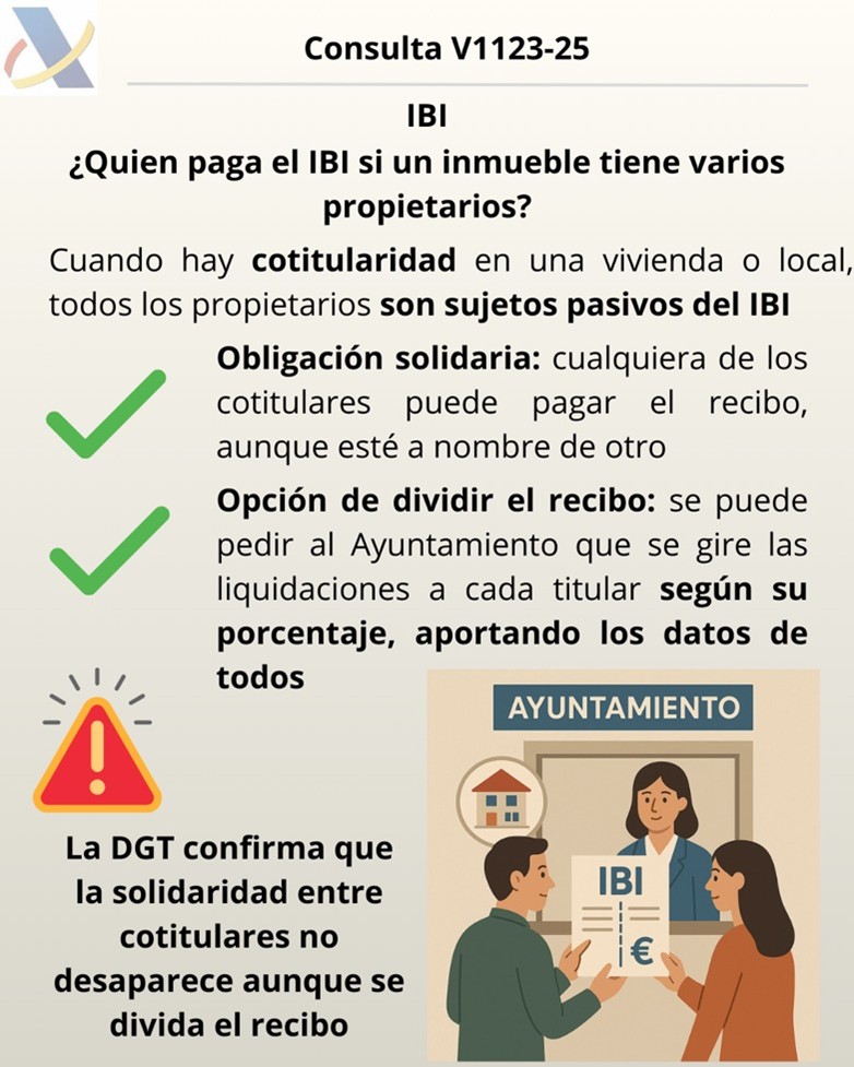 IBI. COTITULARES DE UN INMUEBLE. La DGT confirma que todos los cotitulares son sujetos pasivos del IBI y están solidariamente obligados; cabe solicitar la división de la liquidación aportando datos de los demás titulares