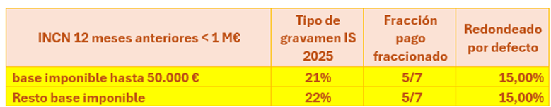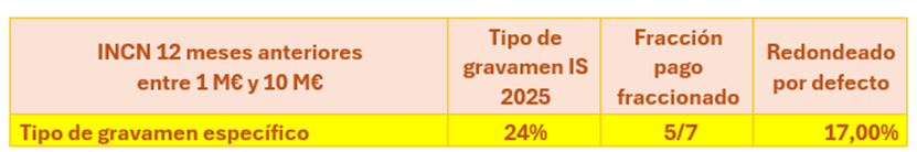 *3 – Teniendo en cuenta el nuevo tipo de gravamen específico para estos grupos, el importe del pago fraccionado será del 17% de la Base Imponible.