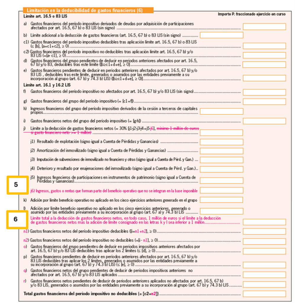 *6 – La nueva letra l) recogerá el importe del límite total a la deducción de gastos financieros netos, en todo caso, 1 millón de euros si el límite a la deducción de gastos financieros netos más la adición de límite consignado en las letras k y l sea inferior a 1 millón