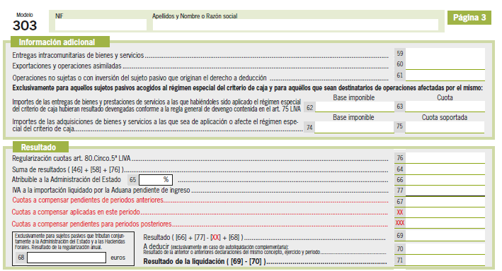 En el apartado Resultado del modelo 303 la casilla 67, que hasta ahora mostraba las cuotas pendientes de compensación aplicadas en la autoliquidación, se desglosa en tres nuevas casillas que facilitarán al contribuyente conocer los saldos de las cuotas a compensar aplicados y pendientes en cada momento. Con el mismo objetivo, la casilla 02 del modelo 353 se desglosa también en tres nuevas casillas.