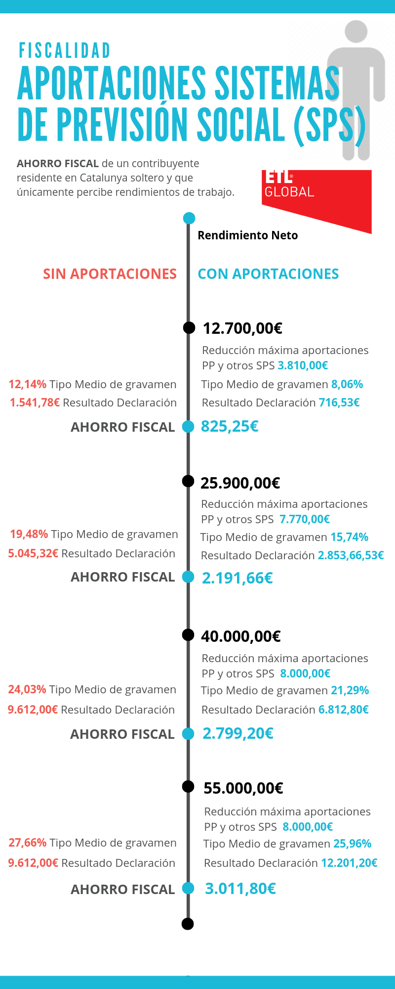 Ejemplo Ahorro fiscal de aportaciones a Planes de pensiones de Contribuyente residente en Catalunya soltero que únicamente percibe rendimientos del trabajo