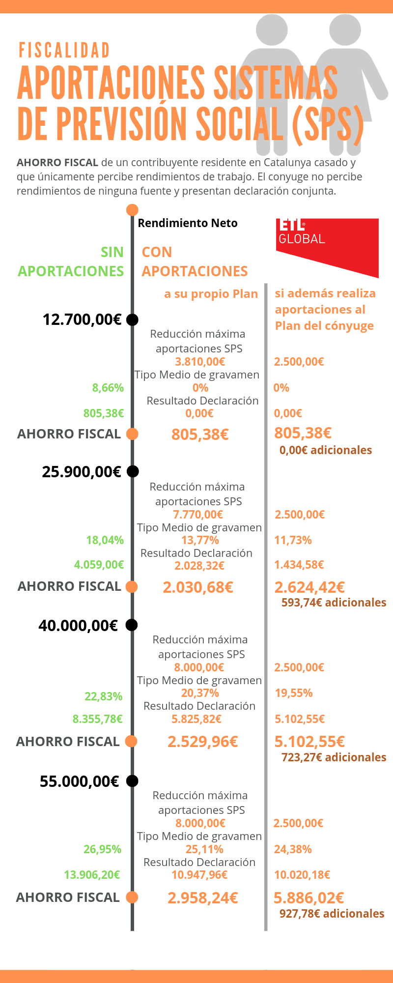 Ejemplo Ahorro fiscal de aportaciones a Planes de pensiones de Contribuyente residente en Catalunya casado y que únicamente percibe rendimientos del trabajo. Cónyuge no trabaja ni percibe ningún rendimiento. Presentan declaración conjunta.