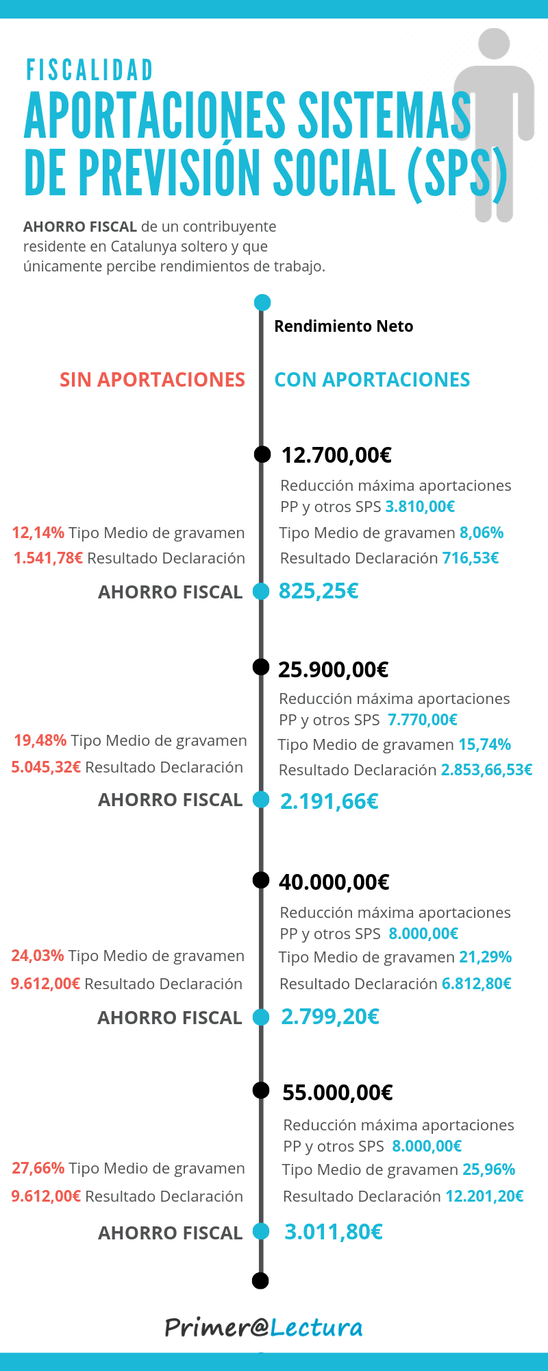 Ejemplo Ahorro fiscal de aportaciones a Planes de pensiones de Contribuyente residente en Catalunya soltero que únicamente percibe rendimientos del trabajo