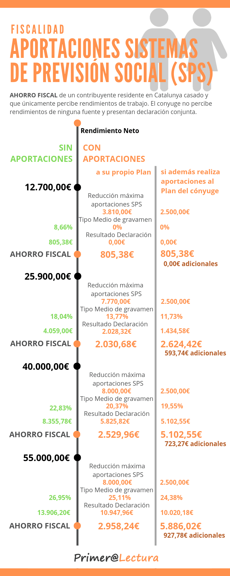 Ejemplo Ahorro fiscal de aportaciones a Planes de pensiones de Contribuyente residente en Catalunya casado y que únicamente percibe rendimientos del trabajo. Cónyuge no trabaja ni percibe ningún rendimiento. Presentan declaración conjunta.
