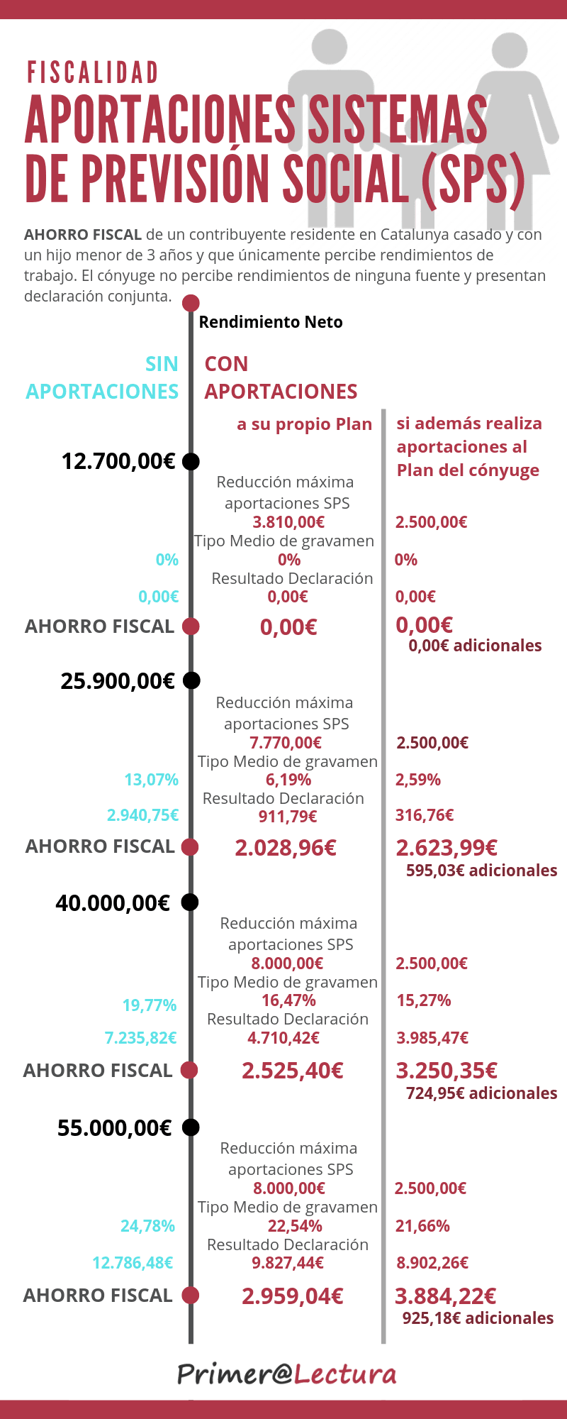 Ejemplo Ahorro fiscal de aportaciones a Planes de pensiones de Contribuyente residente en Catalunya casado y que únicamente percibe rendimientos del trabajo. Hijo menor de 3 años. Cónyuge no trabaja ni percibe ningún rendimiento. Presentan declaración conjunta.