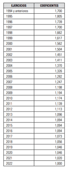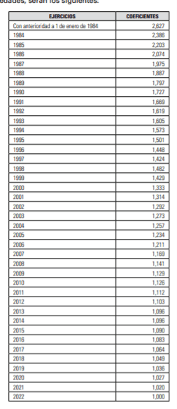 | Coeficientes de actualización aplicables en el ejercicio 2022, a efectos de lo dispuesto en el artículo 45.2 de la Norma Foral del Impuesto sobre la Renta de las Personas Físicas | Coeficientes de corrección monetaria aplicables en el Impuesto sobre Sociedades para los períodos impositivos iniciados durante 2022, a efectos de lo dispuesto en el artículo 40.9 de la Norma Foral 37/2013, de 13 de diciembre, del Impuesto sobre Sociedades |