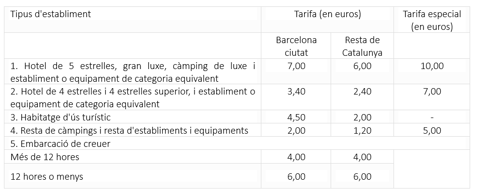 1.La quota tributària s’obté de multiplicar el nombre d’estades pel tipus del gravamen corresponent segons el tipus d’establiment o equipament turístic i localització, d’acord amb la tarifa següent: