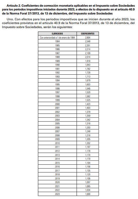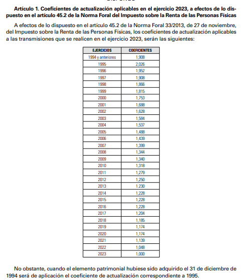 DIPUTACIÓN FORAL DE ÁLAVA. IS/IRPF/TRANSMISIONES. Decreto Foral 1/2023, del Consejo de Gobierno de 17 de enero. Aprobar los coeficientes de actualización aplicables en el Impuesto sobre la Renta de las Personas Físicas y en el Impuesto sobre Sociedades a las transmisiones que se efectúen en el ejercicio 2023.
