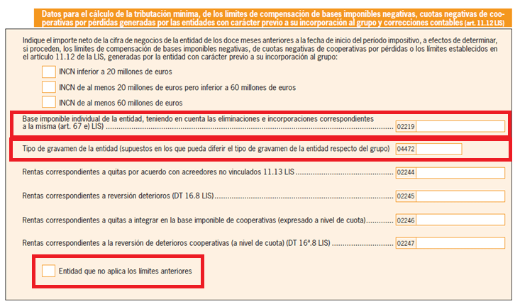 En la página 7L NIF1bis y en la página 9 además de la referencia a que los datos de la cifra de negocios se aplicarán al cálculo de la tributación mínima, se incorporan nuevas claves para informar de los importes que se hayan generado por las entidades individuales previamente a su incorporación al grupo fiscal o, en su caso, a un grupo fiscal previo.
