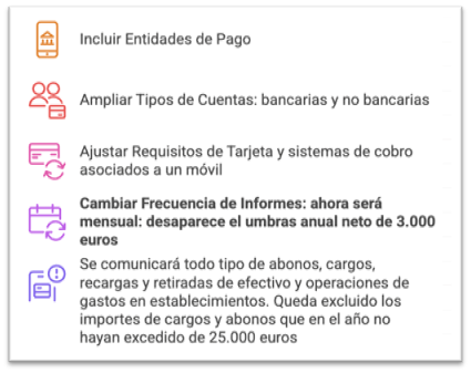 Otra modificación afecta a la obligación de informar sobre pagos a empresarios y profesionales establecidos en España que estén adheridos a sistemas de gestión de cobros mediante tarjetas. En concreto, se modifica para incluir todo tipo de tarjetas y los sistemas de cobro asociados a un número de teléfono móvil.
