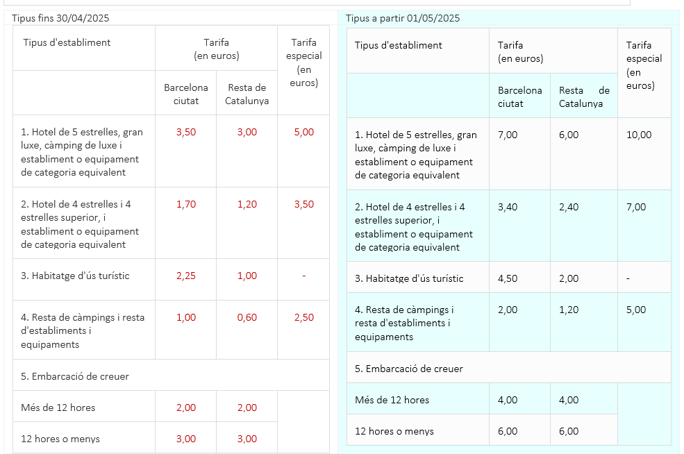 - Es modifica l’article 34.1 amb un augment generalitzat de tarifes per estades turístiques. Les noves quotes dupliquen o fins i tot tripliquen les anteriors segons la categoria de l’establiment i la zona.