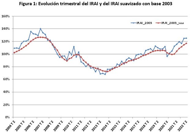 El valor del índice creció muy levemente hasta 125,0 frente a los 124,8 que alcanzó el trimestre anterior y el índice suavizado, libre de factores estacionales, en 116,9 frente a los 114,6 alcanzados en el trimestre anterior. Desde el 2º trimestre de 2020, que marcó 96,4, se viene produciendo una recuperación de la actividad inmobiliaria, a excepción del ligero descenso del 4ª trimestre de 2021. Esta evolución trimestral ligeramente favorable se ha debido, sobre todo, a la tendencia positiva de la actividad de propiedad (0,4%), mientras que en la parte mercantil del IRAI, esencialmente más constante en los últimos trimestres, ha caído el 0,7%.