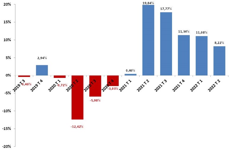 La evolución anual del IRAI durante el segundo trimestre obtiene una subida del 8,2% frente al mismo trimestre de 2021, ralentizando el crecimiento de trimestres anteriores, donde los incrementos superaron ampliamente los dos dígitos. Continuó, por tanto, un crecimiento importante de la actividad durante el segundo trimestre. Como se aprecia en el siguiente gráfico, la evolución anual ha compensado ya claramente los descensos de 2020, y el crecimiento de los cinco últimos trimestres, aunque matizado por la comparación con los peores momentos de la pandemia en 2020, sigue mostrando todavía significativos crecimientos de la actividad inmobiliaria global.
